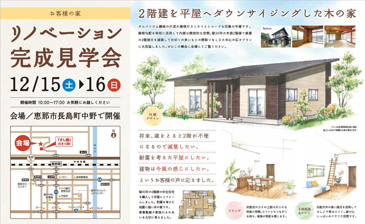2018.12.24 NEWSイベントトピックスモデルハウス内観 2階建を平屋へ ダウンサイジングした木の家完成見学会終了しました。 掲載日: 2018.12.242024.12.5 管理者の投稿 お施主様のご厚意によりお貸し頂いておりました。リノベーション住宅の内覧会12月15日・16日 無事終了しました。 天気が心配でしたが、お出かけしやすい天気で何よりでした。 お越しいただいたみなさま、ありがとうございました […]