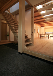 太い桧の大黒柱と階段が存在感を見せる土間。