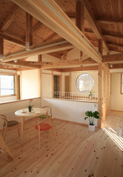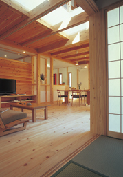 リビングの吹き抜けは骨太の杉の梁の構造美。