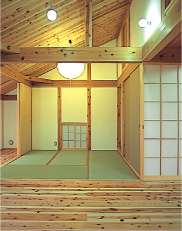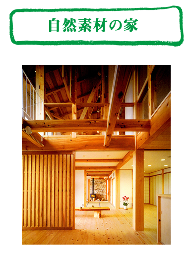 本物の素材と職人の手仕事が人にやさしい気の家をつくる。 柱や床板は桧。天井は杉または和紙張り。壁は漆喰塗りまたは和紙貼り。屋根素材はいぶし瓦またはガルバリウム鋼板。石・土・畳などの自然素材を用いました。土に還る本物素材の家づくりです。