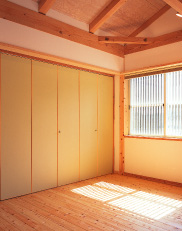 畳には優れた吸放湿性があるので、不快な湿気を吸い取り室内が乾燥すれば水分を放出してくれます。畳には人肌のようなソフトな弾力性があるので、足裏にしっくりなじみます。畳には吸音性があるので、室内に静寂をもたらします。畳は日本人の皮膚の色に近い反射率をもつので、やすらぎを与えてくれます。昔ながらの古風な和室は若い世代に敬遠されますが、壁と天井を洋室和室同仕様にしたシンプルな「雨楽な家」の和室は幅広い世代に人気です。新しい畳の香りは心をなごませてくれます。