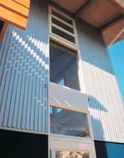 ガルバリウム鋼板はアルミニウムー亜鉛合金めっき鋼板で、トタン板(溶融亜鉛めっき鋼板)に比べ三~六倍以上の耐久性があります。その秘訣はアルミニウムと亜鉛の組み合せにあり、アルミニウムは長期耐久性をもち、亜鉛は自ら溶けて鋼板を錆から守る犠牲防食作用を発揮。両者があいまって鋼板を錆から守るので、海岸沿いでも高い耐食性を発揮します。素地のまま使いシンプルな素材感を楽しむもよし、着色してもおしゃれです。軽量で建物への負担が少ないので活用がさらに期待されます。