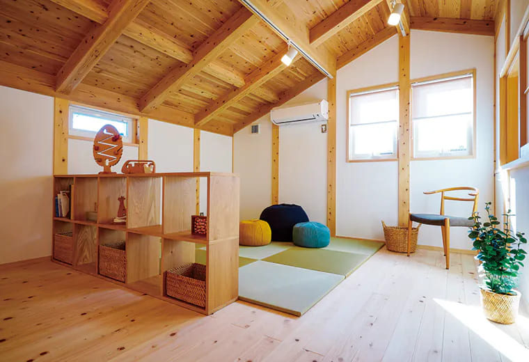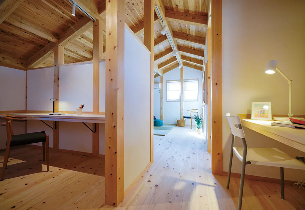 2階は木目の表情豊かな勾配天井が注目の的です。広いフリースペースはセカンドリビングに活用できて、家族のライフステージに合わせて家具で間仕切りをすれば多目的に使えます。壁に仕切られたワークスペースではカウンターテーブルで集中して仕事や勉強、趣味に取り組めます。上部の壁はオープンなので空調は1台でまかなうことができます。